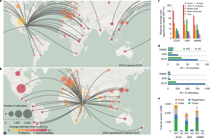 Cost of attendance for individual attendees was computed for historically IPCs-turned-VCs by calculating their cost of travel based on air travel distance and summing with the estimated cost of the hotel, food and conference registration fees. Travel cost was calculated as the one-way air travel distance multiplied by the cost distance for air travel defined in ref. 22 and doubled to represent the cost of a round-trip flight. If the registrant was local, their travel cost was set to 0. If the registrant origin was not known, the travel cost was set to the average conference travel distance and converted to cost using ref. 22. To account for a potential overestimate of travel cost, a sensitivity analysis where the one-way flight cost is multiplied by 1.5 instead of 2 was conducted and is presented in Supplementary Table 1.