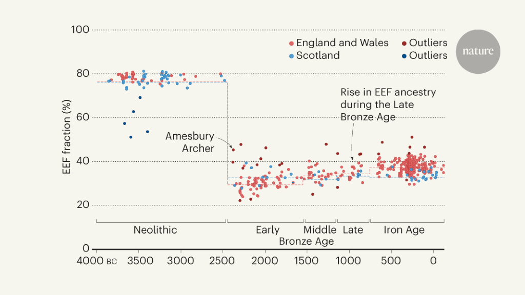 The genomes of hundreds of individuals who lived in Great Britain and in continental Europe during the Bronze Age provide evidence for a migration of people from the continent to southern Britain between 1000 and 875 bc. Ancient DNA shows changes in early European farmer ancestry.