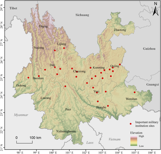 Spatiotemporal characteristic of Biantun toponymical landscape for the evolution of Biantun culture in Yunnan, China The geographical environment of Yunnan Province in China and Han migration during the Ming Dynasty contributed to the development of the Biantun culture. Biantun toponyms (BTT) record the integration process between the Central Plains and native Yunnan cultures. The GIS analysis method of toponyms was used in this study to reproduce the settlement characteristics of BTT and the spatial development of the Biantun culture in the Ming and Qing Dynasties. In addition, we have developed a toponymical landscape index to represent the degree of spatial integration between the BTT and ethnic minority toponyms in Yunnan and explore the spatial characteristics of the integration of Han immigrants and local ethnic minorities. The results show that the spatial distribution of the BTT is consistent with the sites selection of the Tuntian (屯田) in Yunnan during the Ming and Qing Dynasties, and the centroids of BTT spread to outskirts and intermontane area from central towns. In the Dali, Kunming, Qujing and other regions, the distribution characteristics of the integrated of BTT and ethnic minority toponyms reflect a higher degree of Sinicization in the central urban areas. Exploring the evolution of Biantun cultural development through the spatial characteristics of toponymical landscapes can help adjust policies for the development and protection of Biantun cultural resources. The ‘Tun (屯)’ in the Biantun culture originally means cluster, and ‘Biantun (边屯)’ refers to established settlements (clusters) in frontier regions. Specifically, Biantun culture refers to a comprehensive cultural phenomenon that occurred during the historical process of developing, building, and defending the frontier by the ethnic groups who migrated and settled in those frontiers, as well as their native residents. Biantun culture takes the Central Plains culture as the core, relies on the frontier regional culture, integrating the traditional culture of the local ethnic groups, with the typical cultural characteristics of garrison reclamation to guard the frontier1.Yunnan is a large province in the frontier and has been an important region for ethnic migration and cultural exchanges since ancient times. During the Hongwu (洪武) period of the Ming Dynasty, after stabilizing the situation in Yunnan, the Ming government established the WeiSuo (卫所)2,3,4 system and local institutions at different levels, carried out reclamation by garrisoning Yunnan. In order to meet the needs of military defense and facilitate the conditions for farming, the military WeiSuo were mainly stationed at important military places and basin districts, distributed along major traffic roads and around cities and towns5. Due to the development of the military Tun, civilian Tun and commercial Tun, a large number of Han immigrants from the Central Plains came to Yunnan and gradually integrated with the local ethnic groups through processes such as intermarriage. With the resulting changes in population structure, ethnic distribution, production relations, political systems, and cultural orientation, the Biantun culture of Yunnan flourished during this period1. There are still a large number of Biantun relics in Yunnan, such as toponyms such as Suo (所), Ying (营), Tun (屯), Pu (铺), etc. and guild halls. The protection of Biantun culture in Yunnan Province—including Yongsheng County, the site of Lancang Wei (卫), Mao’s Ancestral Hall, and Taliu (他留) culture6,7—provides rich resources for modern researchers.A cultural landscape is an area shaped by historical human activities, which possesses or retain special cultural value8. As an important part of a cultural landscape, toponyms are a powerful source of information. Toponyms can preserve information about social, linguistic, and political changes; production economy; military activities; and more9,10. As such, toponyms can provide information on the ways in which communities of historical settlers perceived and transformed their environments.Since 1990, quantitative research has gradually become the mainstream research method of place names. Computer technology has been introduced to optimize traditional research methods, promote the research of place names and cultural landscapes, and accumulate rich research results, such as national toponyms, plant toponyms and so on11,12,13,14,15,16. In addition, Siwei Qian et al.17 used spatial analysis methods to study the relationship between the spatial pattern of toponyms, ethnic population and topographical factors. Franco Capra et al.18 integrated an ethnopedological approach and mathematical statistics to study Sardinian toponyms influenced by natural and social factors. In summary, the main characteristics of quantitative research on toponyms is to combine traditional cultural geography research ideas, using GIS technology, computer technology and quantitative analysis methods to analyze toponym landscapes9.In this paper, we will analyze the evolution of Biantun culture from the perspective of BTT. The research on the BTT has so far been limited to the review of cultural connotations and historical evolution1,19,20. Most studies focused on Yongsheng County7,21 and lacked quantitative analysis. From the perspective of historical geography, we use GIS to quantitatively analyze the spatiotemporal distribution characteristics and historical evolution of the cultural landscape of BTT in Yunnan to reveal the relationship between spatial patterns of toponyms and the populations at different periods. The methods used in this study allow exploration of the geographical and spatial patterns of ethnic integration, which may introduce a new perspective on the emergence of Biantun culture.Yunnan is located on the southwestern border of China (Fig. 1). During the early Ming Dynasty (AD1368-1435), wars in Yunnan were freq
