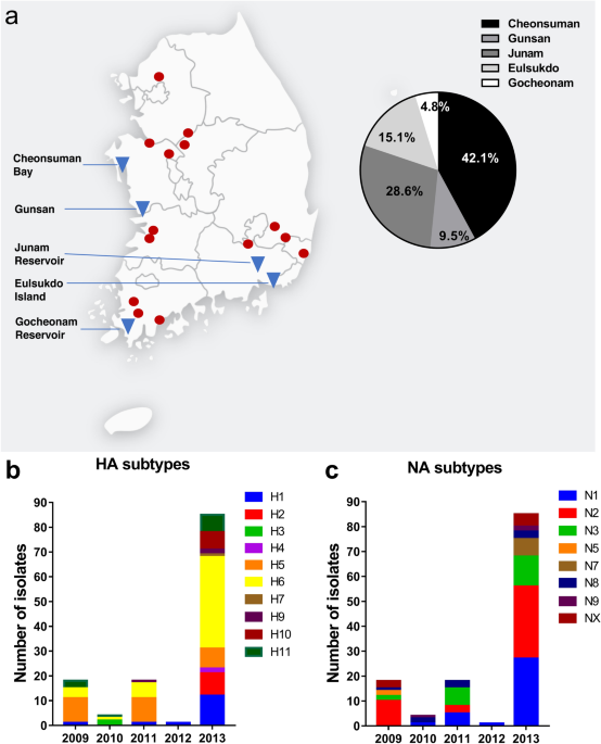 Among the HA subtypes that have the ability to cross the mammalian species barrier, two HA subtypes, H5 and H7, are associated with high pathogenicity7. Notably, HPAI H5N1 and H7N9 viruses are genetic reassortants of LPAI segments8,9. Thus, LPAI viruses are potential precursors of novel HPAI viruses. However, since it is virtually impossible to prevent the transmission of influenza A virus from wildfowl to domestic and wild animals, continuous surveillance of wild birds must be conducted to monitor and detect strains that have the potential to cause disease in both animals and humans.In this study, we report the surveillance of AIVs in wild birds in South Korea during the winter seasons of 2009 to 2013. We isolated fecal samples from migratory bird stopover sites in South Korea, which is part of the East Asian-Australasian flyway (EAAF), and performed nucleotide sequence analysis to determine the distribution of AIVs among migratory wildfowl in South Korea.During the winter seasons of 2009‒2013, a total of 7942 wild bird fecal samples were collected from wild migratory bird habitats in South Korea (Fig. 1a). HPAI isolates have been obtained from wildfowl in these sites, and these locations are adjacent to sites of known HPAI outbreaks among poultry in South Korea, making these sites ideal for surveillance10. From the 7942 fecal samples, 126 AIVs were isolated through the standard chicken egg isolation method11,12 (Table 1). Eighteen viruses were isolated in 2009, 4 in 2010, 18 in 2011, 1 in 2012, and 85 in 2013 (Table 1). The annual AIV isolation rate ranged from 0.42 to 5.14%, and the total virus isolation rate was 1.59% (Table 1). The location with the highest number of isolates was Cheonsuman Bay in Chungnam, South Korea (Fig. 1a).Figure 1Sampling sites and hemagglutinin (HA) and neuraminidase (NA) subtypes of isolated avian influenza viruses from the fecal matter of wild migratory birds from 2009–2013. (a) Sampling sites (triangles) from 2009–2013, and representative clusters of highly pathogenic avian influenza outbreaks in poultry in South Korea from 2008–2014 (circles). Frequencies of isolates (out of 126 total isolates) per sampling site are shown in the pie chart. All (b) HA and (c) NA subtypes were identified through reverse transcription polymerase chain reaction using universal primers.Table 1 Isolation rates of AIVs from wild migratory bird fecal samples in South Korea, winter 2009‒2013.HA and NA subtype combinationsReverse transcription polymerase chain reaction (RT-PCR) using full-length influenza A virus universal primers was performed to determine the HA and NA subtypes of the isolates13. In the course of the 5-year study, we were able to identify the HA and NA subtypes of 118 out of 126 isolates (Table 2). In particular, we were able to isolate the H1‒H7 and H9‒H11 HA subtypes, and the N1‒N3, N5, and N7‒N9 NA subtypes of influenza virus from the fecal matter of wild migratory birds. The distributions of the HA and NA subtypes isolated per year are shown in Fig. 1b,c.Table 2 Distribution of influenza A virus HA and NA subtypes among 126 avian influenza virus isolates.Over the 5-year sampling period, H6 (38.1%), H5 (22.2%), and H1 (11.9%) were the most frequently isolated HA subtypes, followed by H11 (8.7%), H2 (7.1%), H10 (5.6%), H9 (2.4%), H3 (1.6%), H4 (1.6%), and H7 (0.8%) (Table 2; Fig. 2a). Viruses belonging to the H8 and H12‒H16 subtypes were not detected. The most frequently detected NA subtypes were N2 (33.3%), N1 (27%), and N3 (16.7%), followed by N8 (7.1%), N7 (5.6%), N9 (2.4%), and N5 (1.6%) (Table 2; Fig. 2b). Viruses belonging to the N4 and N6 subtypes were not detected. However, the NA subtypes of 8 samples were not identified (NX: 6.3%) possibly due to mutations on the sites targeted by our NA primer sets. In total, 28 combinations of HA and NA subtypes were isolated (Table 2; Fig. 2c), and the most frequently isolated subtype was H6N2 which accounted for 19.8% (n = 25) of all isolates, followed by H6N1 (13.5%, n = 17), H1N1 and H5N2 (at 8.7% each with n = 11 per subtype), and H5N3 (7.1%, n = 9). Certain HA subtypes were found in combination with only one NA subtype: H3 combined with only N8; H4 with N2; H7 with N7; and H9 with N2. Based on the HA and NA sequencing data, no co-infection with two or more AIV subtypes was found in any sample. There was also high variability among the isolated AIV subtypes and the isolation rates per year.Figure 2Overall frequency of hemagglutinin (HA) and neuraminidase (NA) subtypes of avian influenza viruses (AIVs) isolated from the fecal matter of wild migratory birds in Korea (2009–2013). The frequencies of (a) HA subtypes, (b) NA subtypes, and (c) HA and NA combinations of AIV isolates were calculated relative to the total number of isolates (n = 126). NX: unknown NA subtypes.HA and NA sequence comparison of avian influenza isolatesTo determine the genetic relationship of the isolates with HPAI HA, we compared the HA and NA genes of representative avian influenza isolates with known sequences. BLAST analysis of the HA and NA gene segments of avian influenza isolates revealed that most of them were similar to Eastern Asia genetic strains circulating in China, Korea, Japan, and Mongolia (Supplementary Table S1). All the H6- and H11-type isolates were found to have HA genes closely related to strains from the Republic of Georgia and the Netherlands (Supplementary Table S1). In our analysis, the HA gene nucleotide sequences of avian influenza isolates were similar to those of low-pathogenicity influenza strains and did not match any high-pathogenicity influenza strains.Phylogenetic analyses of H6- and N2-subtype isolatesGiven the frequency of H6-subtypes among our isolates and, we next compared representative H6 isolates from our study with previously reported H6 isolates from different locations via phylogenetic analysis. In general, our isolates clustered with those obtained from wild birds in differe